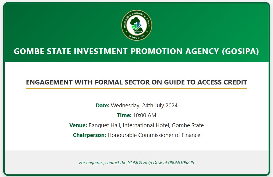 The Gombe State Investment Promotion Agency (GOSIPA) is set to host a Formal Sector Engagement on the Guide to Access Credit, an initiative designed to strengthen access to finance for businesses operating within the State.